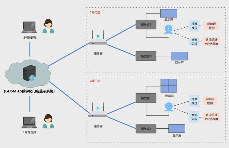 该客户为宁波地区零售门店,在一段时间内,客户发现门店销售额持续下滑,但是不知道原因出在哪里,到底是消费者减少,还是广告推送出现问题,亦或是其他原因,客户没有头绪,开云电子科技数据化门店显示系统完美的解决了客户痛点,方案拓扑图如下: