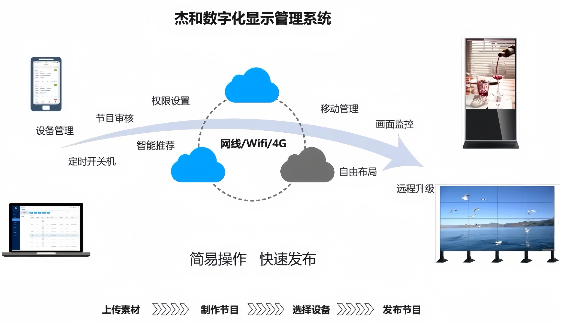 目前kaiyun电子科技GDSM-ES系统覆盖市场上多形态网络智能显示终端,满足行业全产品业态需求,如广告机、LED显示屏、LCD拼接屏 、普通液晶电视等各种显示终端,广泛用于广告宣传、通知公告、指示引导。