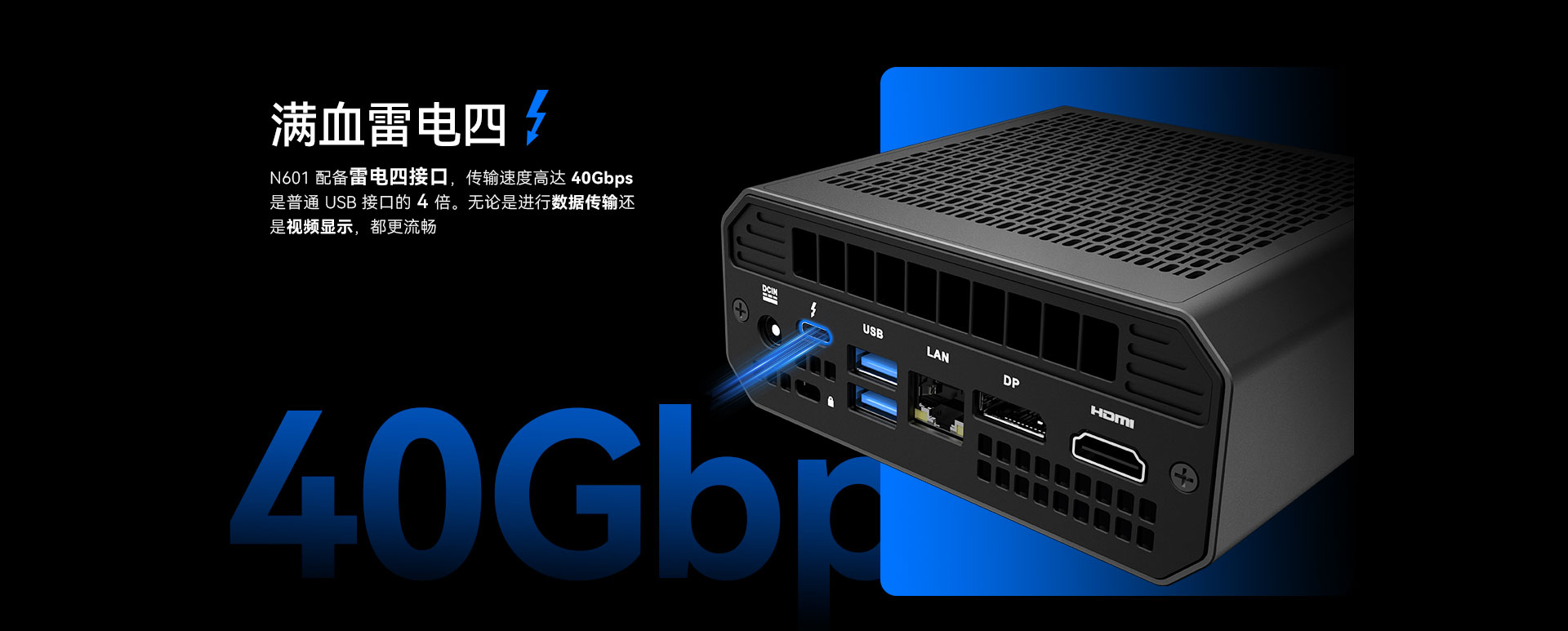 kaiyun电子科技N601配备雷电四接口,传输速度高达40Gbps,用户可通过该接口连接2块屏幕。还可通过HDMI2.1接口,DP1.4接口再连接两块屏幕,实现四屏异显。雷电四还可以连接外设,如鼠标、键盘、控制器和耳机等。