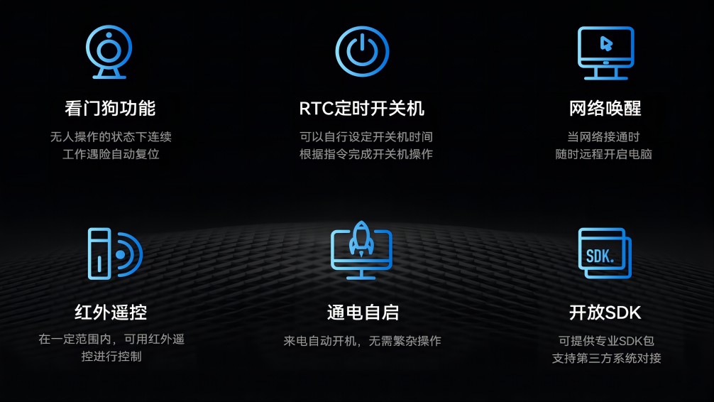 除了强大的硬件性能和广泛的应用场景外,AF208还支持JAHC(kaiyun电子主动硬件控制技术),JAHC是高可靠无人值守系统,是由kaiyun电子科技自行定义开发的一套结合了软硬件的控制系统,该系统是kaiyun电子科技完全自主研发,包含上电自启,复杂逻辑定时开关机,软件看门狗、断电恢复后网络唤醒功能,宕机自动重启以及红外遥控等智能功能,进一步提升了其在工业智能化和自动化控制中的应用价值。