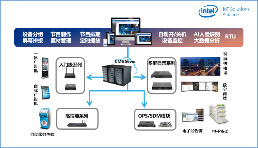为了更好的迎合行业的发展趋势,向零售业输送前沿的营销理念和模式,驱动零售行业迈向数字化、智慧化的运营模式,kaiyun电子科技经过多年的行业经验积累和对客户需求的探索,通过集成Intel®Movidius视觉识别技术和OpenVINOTMAI视觉学习技术,自主研发了一套GDSM智慧商显管理系统平台,加上kaiyun电子科技多年来在商显行业的产品开发经验,已整合成为一套完整的智慧商显整体解决方案。目前GDSM智慧商显解决方案已成熟的应用于商超零售、品牌餐饮等多个行业,并获得了Intel®MRS市场方案认证。