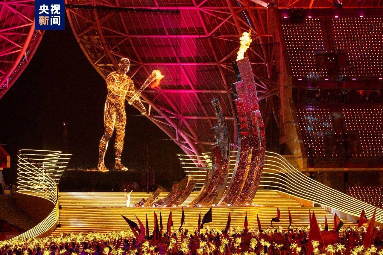 9月23日晚,杭州第十九届亚洲运动会开幕式上,数字火炬手“弄潮儿”举着火炬,一路奔跑,跨过钱塘江踏浪而来,奔向“大莲花”体育场,将火炬伸向火炬塔“潮涌”,亚运圣火燃向塔顶,全场沸腾,最后跃至体育馆上空逐渐幻化为漫天星辰点亮万家。